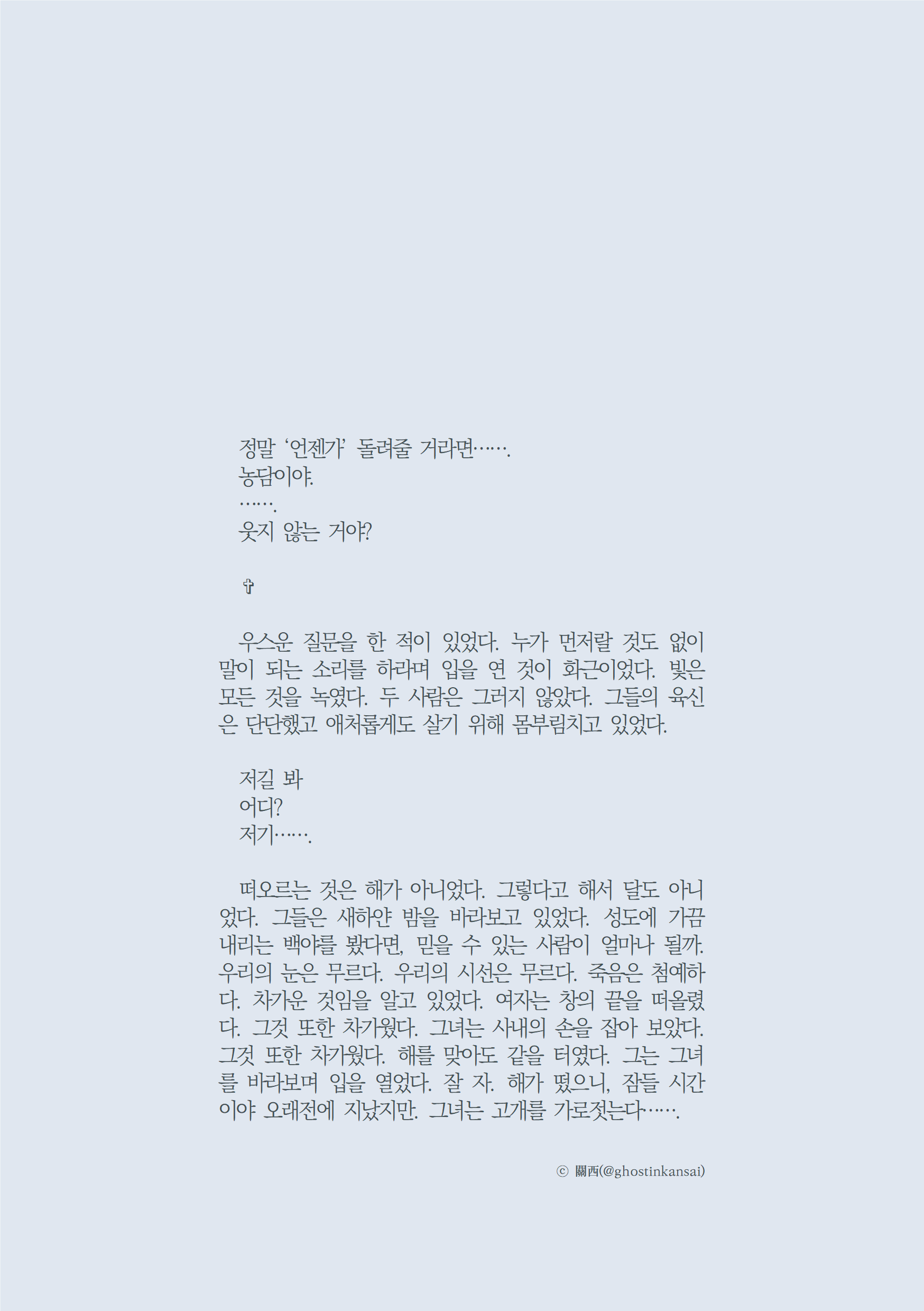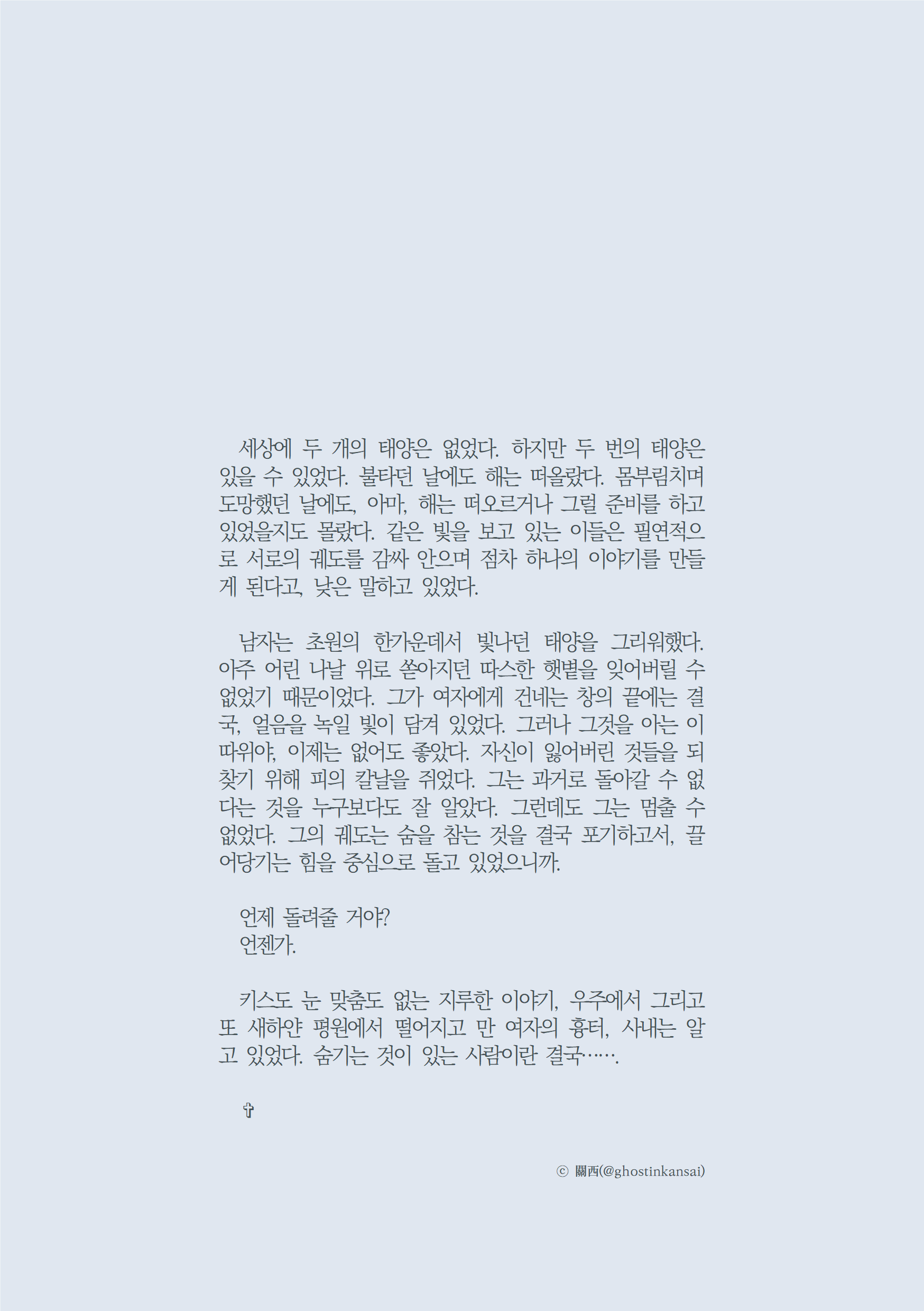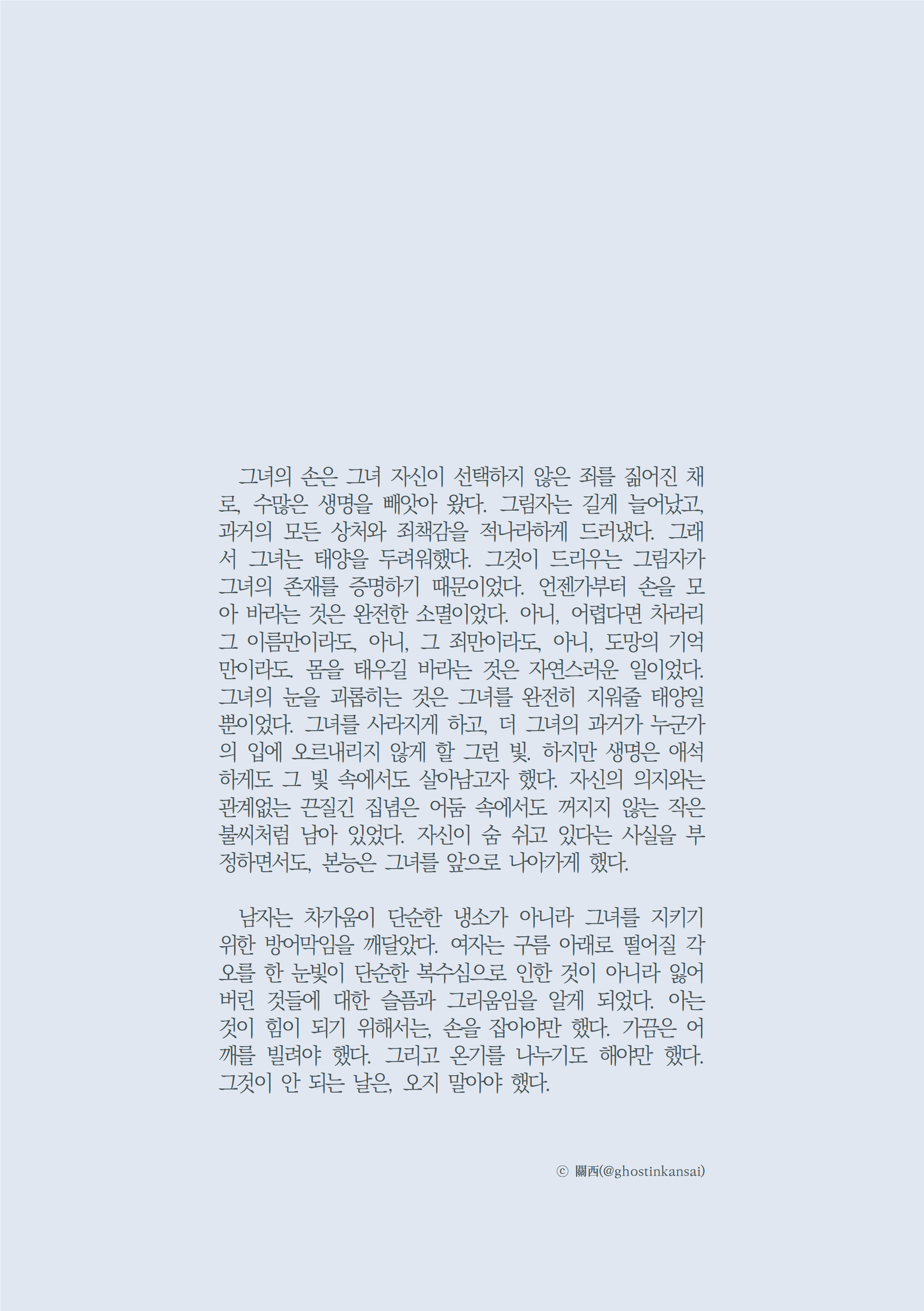 ⓒ 관서님 타입 외 text • 2025. 1. 25. A A default 글 관서 ⓒ ghostinkansai 이전다음 0123 공유하기 게시글 관리 Migratory Birds 'text' 카테고리의 다른 글 고독의 호수 (0) 2025.03.01 羊の詩 (0) 2025.03.01 ⓒ 관서님 손가락¹ (0) 2025.01.20 Diamond Dust (0) 2024.10.25 ⓒ 요정님 (0) 2024.10.10