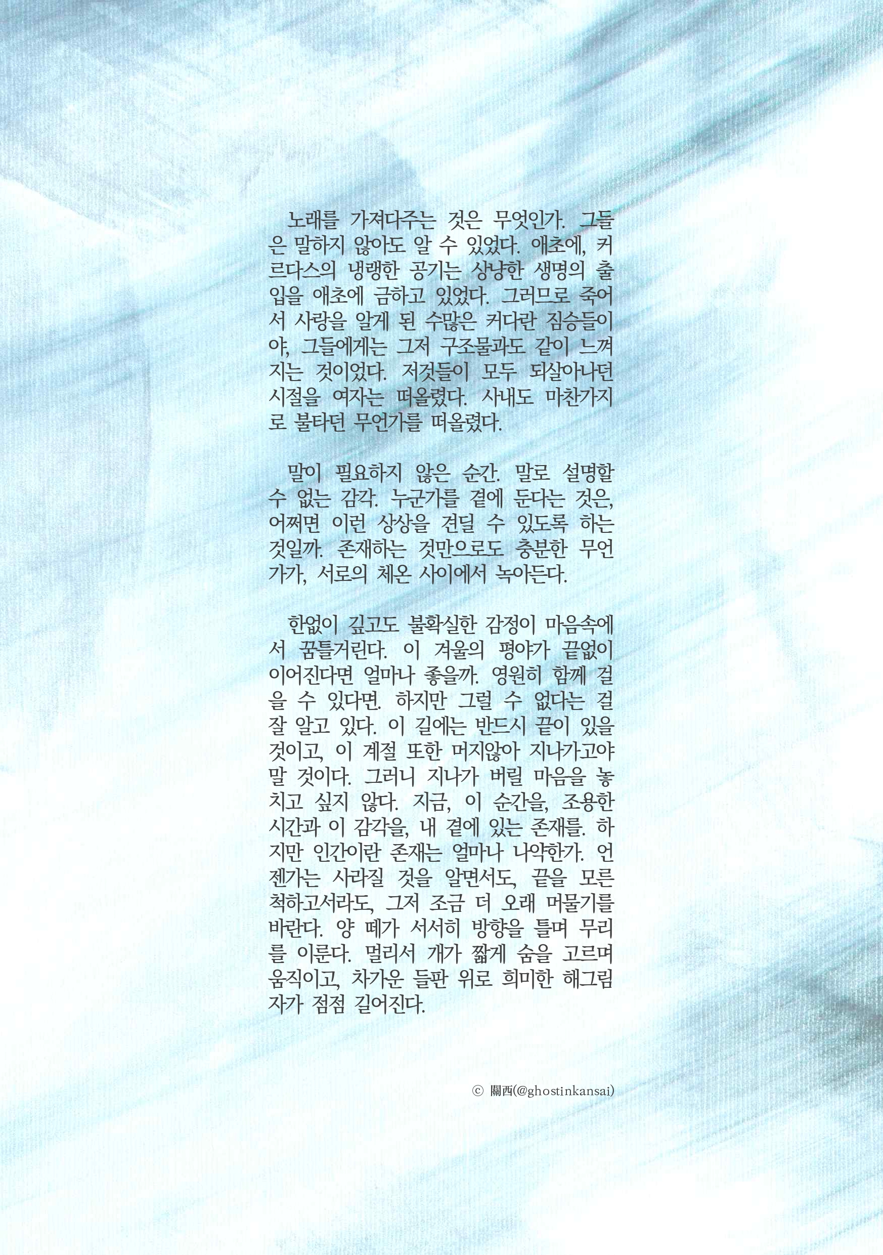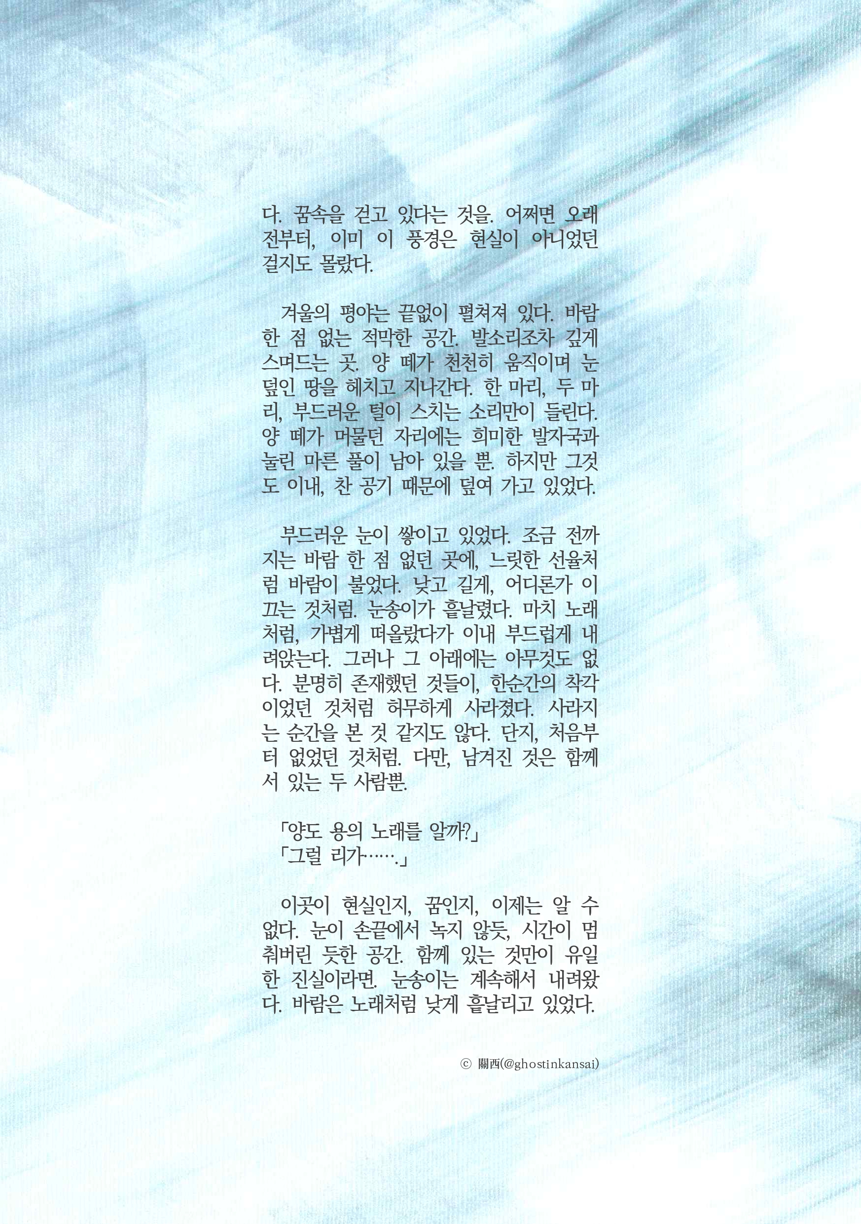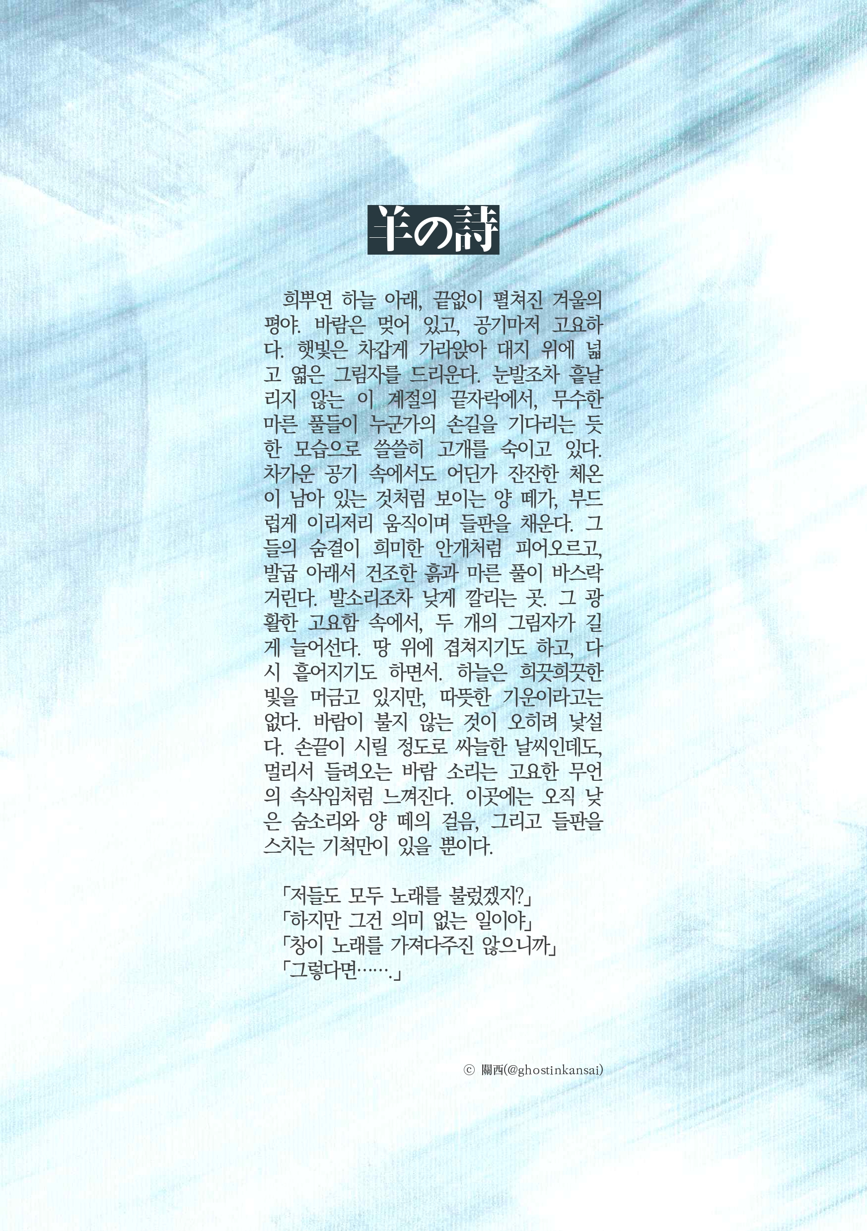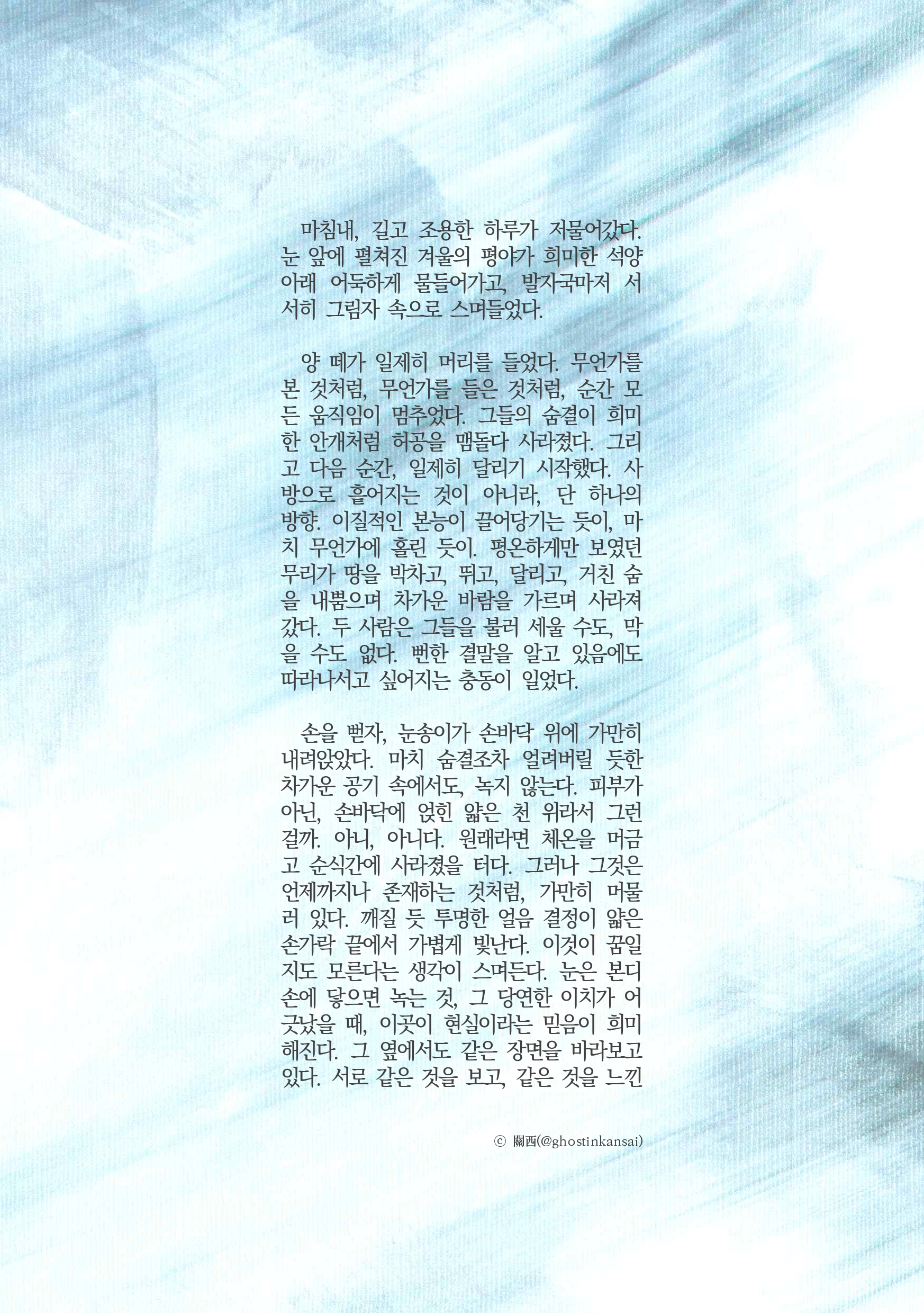 羊の詩 text • 2025. 3. 1. A A default 羊の詩 글 관서 ⓒ ghostinkansai 이전다음 0123 공유하기 게시글 관리 Migratory Birds 'text' 카테고리의 다른 글 나를 바람이라고 생각해 (0) 2025.04.05 고독의 호수 (0) 2025.03.01 ⓒ 관서님 타입 외 (0) 2025.01.25 ⓒ 관서님 손가락¹ (0) 2025.01.20 Diamond Dust (0) 2024.10.25