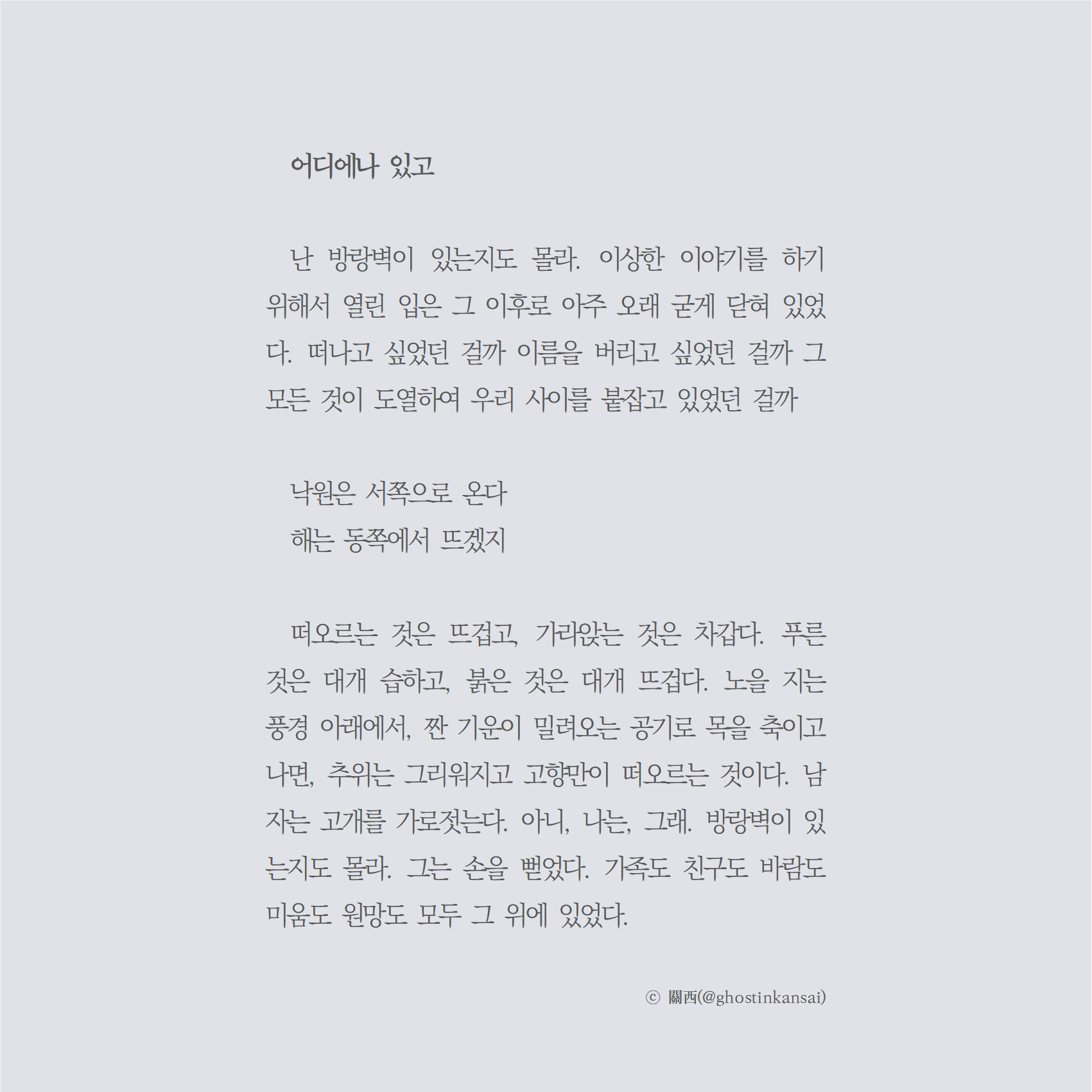 ⓒ 관서님 손가락² text • 2025. 4. 25. A A default 글 관서 ⓒ ghostinkansai 이전다음 0123 공유하기 게시글 관리 Migratory Birds 'text' 카테고리의 다른 글 ⓒ 관서님 (0) 2025.05.15 ⓒ 관서님 (0) 2025.04.25 ⓒ 관서님 911¹ (0) 2025.04.12 나를 바람이라고 생각해 (0) 2025.04.05 고독의 호수 (0) 2025.03.01